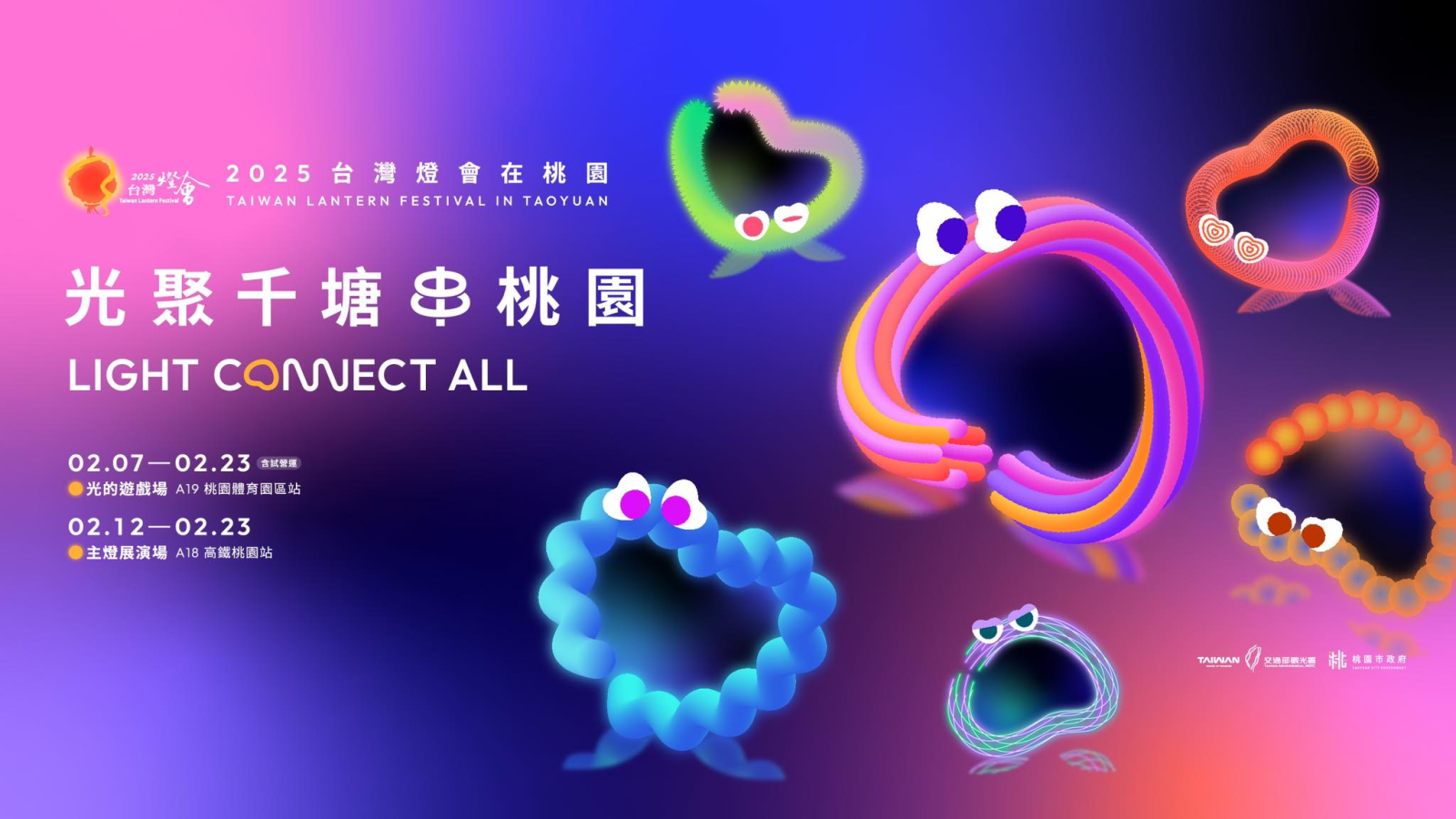 —2025 台灣燈會— 【光聚千塘串桃園】 以「光聚千塘串桃園」為主題, 打造一場結合科技、文化與親子互動的觀光盛會, 白天能遊歷各人氣景點,晚上則前往桃園燈會遊逛, 感受桃園日夜多變魅力。